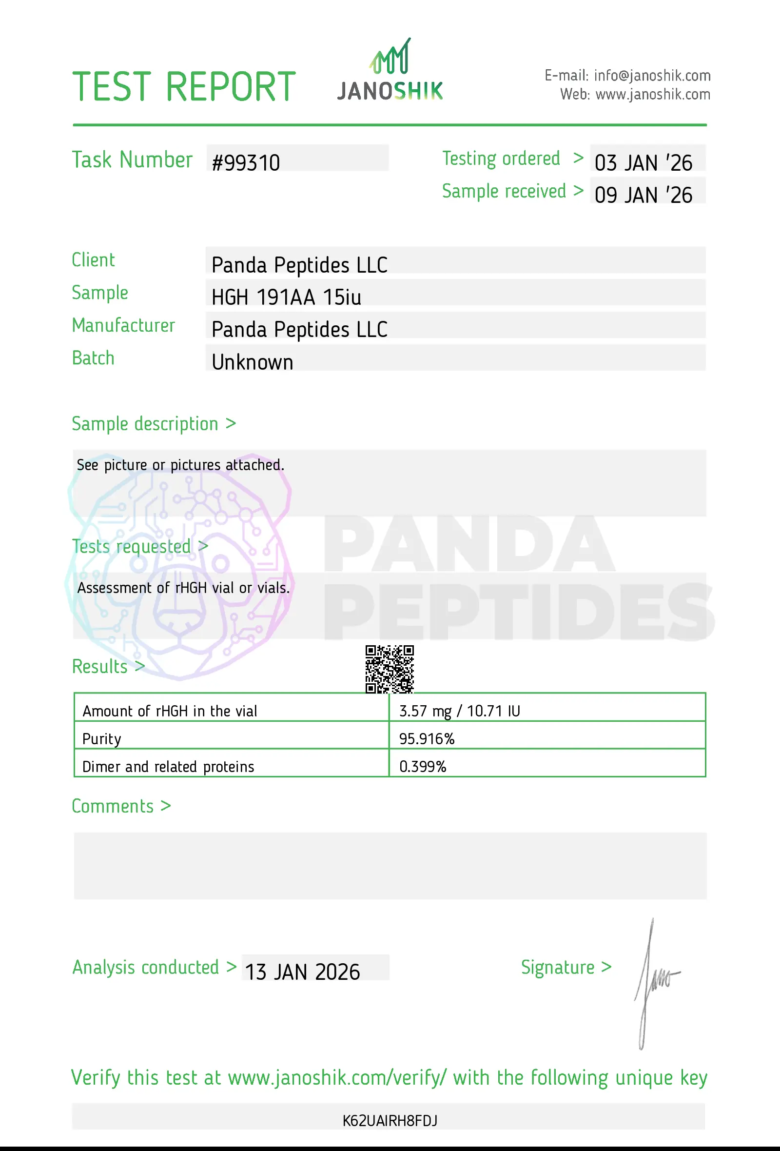 - Purity: ≥95% (Janoshik verified)