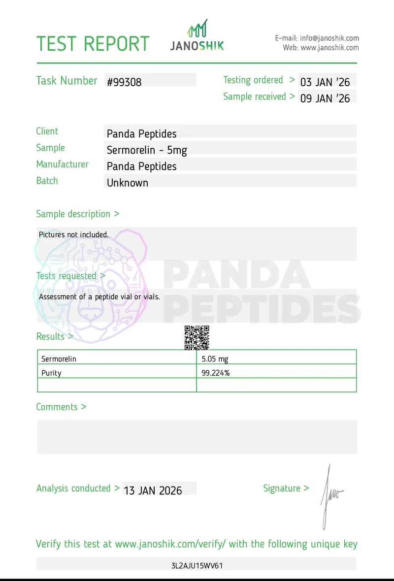Sermorelin is a synthetic 29-amino acid peptide. CAS 86168-78-7. Molecular weight 3357.9 Da. Supplied as a lyophilized powder, >99% purity by HPLC. Research compound — for laboratory use only.